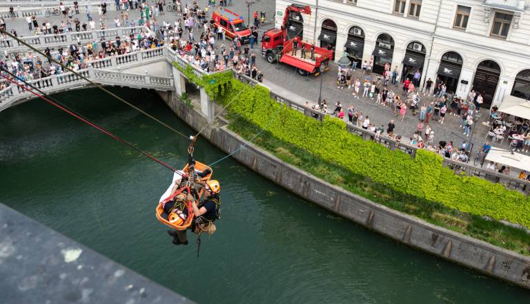 FOTO in VIDEO: Čez Ljubljanico napeta vrv, na njej dva gasilca - kaj se dogaja?